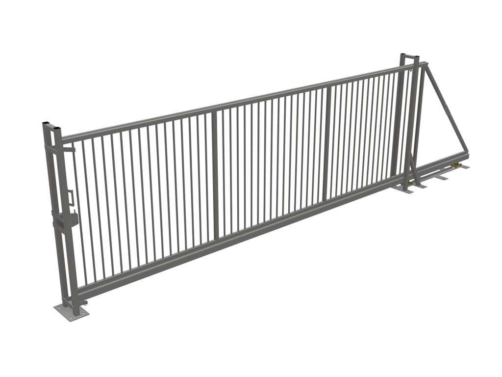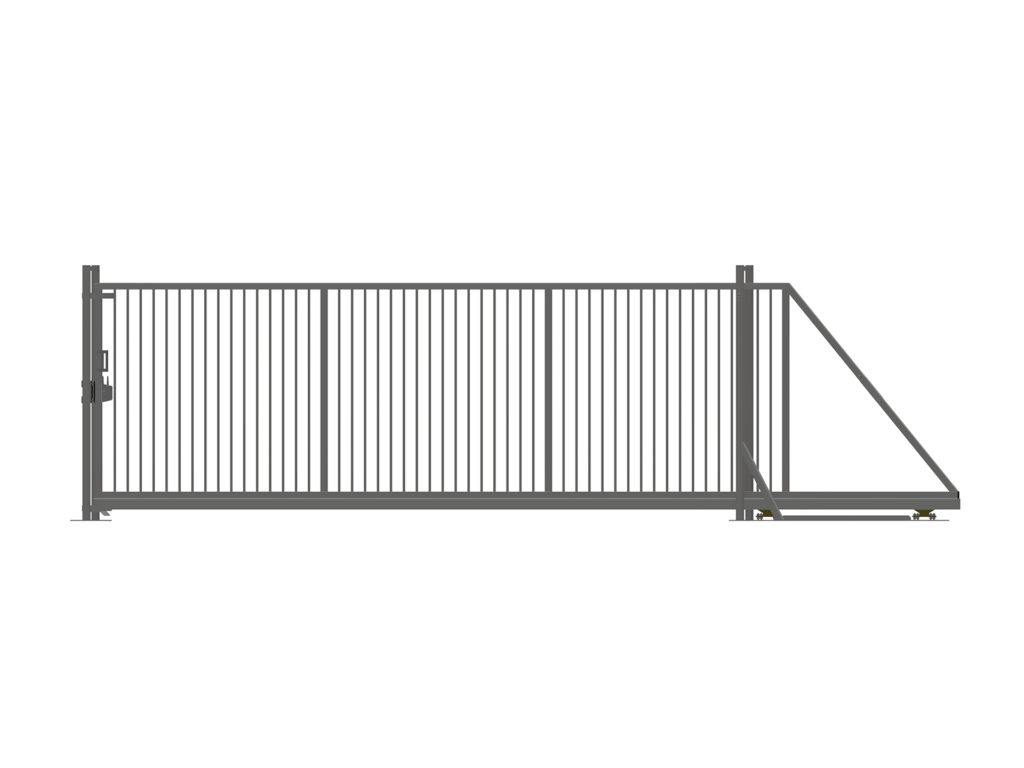 Den dubbelsidiga ändstolpen är tillverkad av fyrkantsprofil och utrustad med grindfång, för att styra och stödja grindbladet när grinden är i slutlig rörelse eller helt stängd. Styrstolpen är tillverkad av fyrkantsprofiler.
